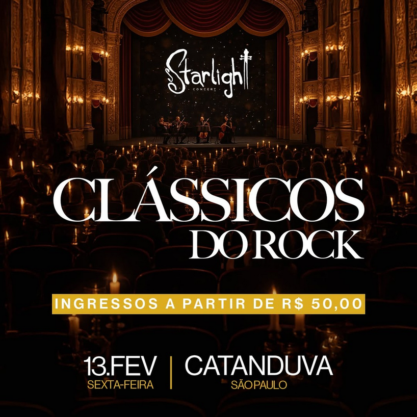 O espetáculo Starlight Concert – Clássicos do Rock traz uma viagem sonora pelos maiores hinos do rock, em versões poderosas e emocionantes, sob uma atmosfera única.