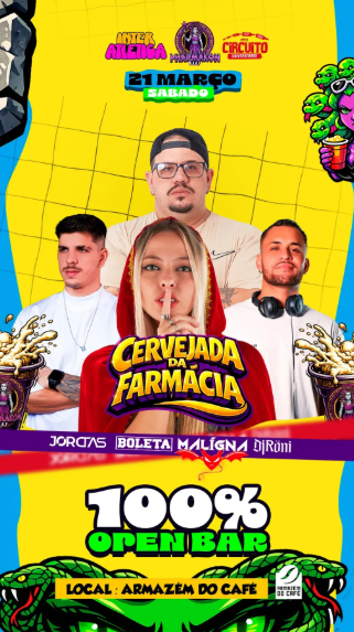 Vem aí a Cervejada da Farmácia, aquele evento que já nasce histórico e promete ser simplesmente insano! Open bar liberado pra galera curtir sem limites, muita música boa e energia lá em cima do começo ao fim.